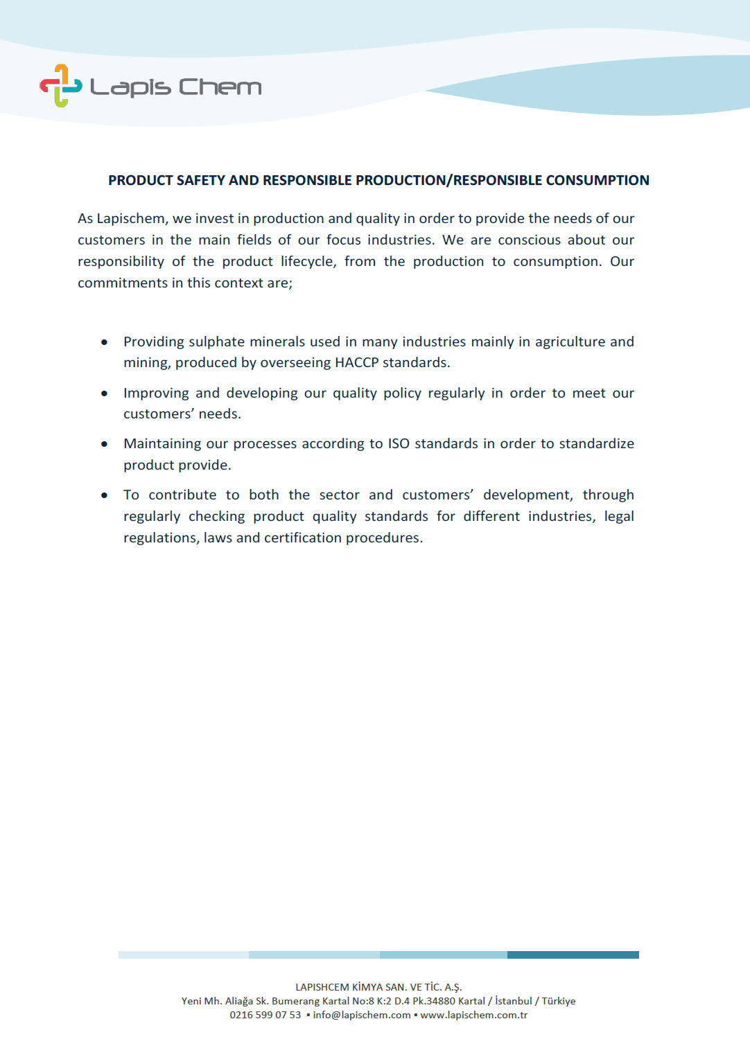 We are aware that we are responsible for all stages of a product, from production to consumption, in the circular economy. In this context, we ensure that our sulfate minerals used in various sectors, especially agriculture and mining, are produced according to HACPP standards.