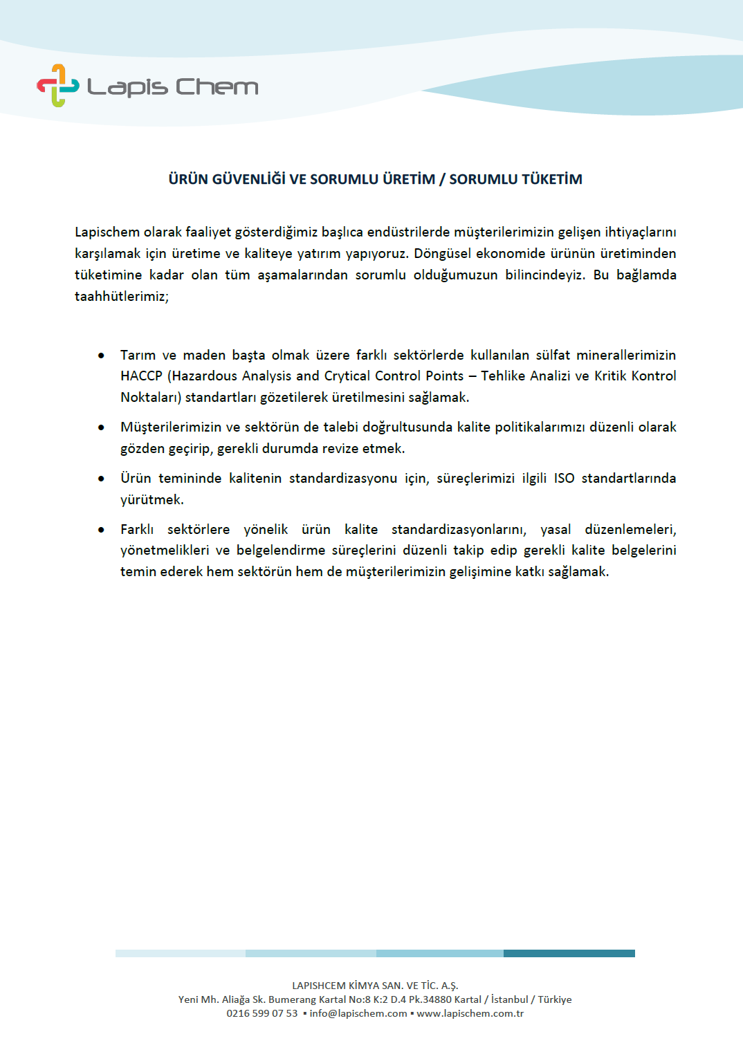 We are aware that we are responsible for all stages of a product, from production to consumption, in the circular economy. In this context, we ensure that our sulfate minerals used in various sectors, especially agriculture and mining, are produced according to HACPP standards.